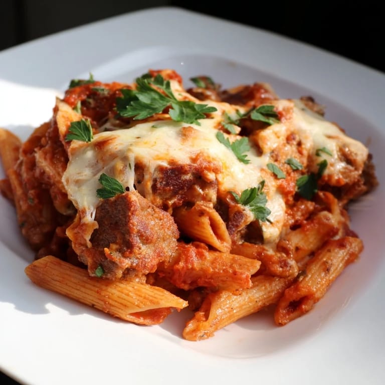 Pin It A hearty family-friendly pasta bake loaded with savory sausage melty cheese and a rich tomato sauce—perfect for feeding a crowd on a budget.
