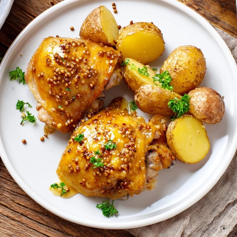 Pin It Succulent chicken thighs baked in a tangy honey mustard sauce, served alongside crispy roasted potatoes for a comforting, flavorful meal.