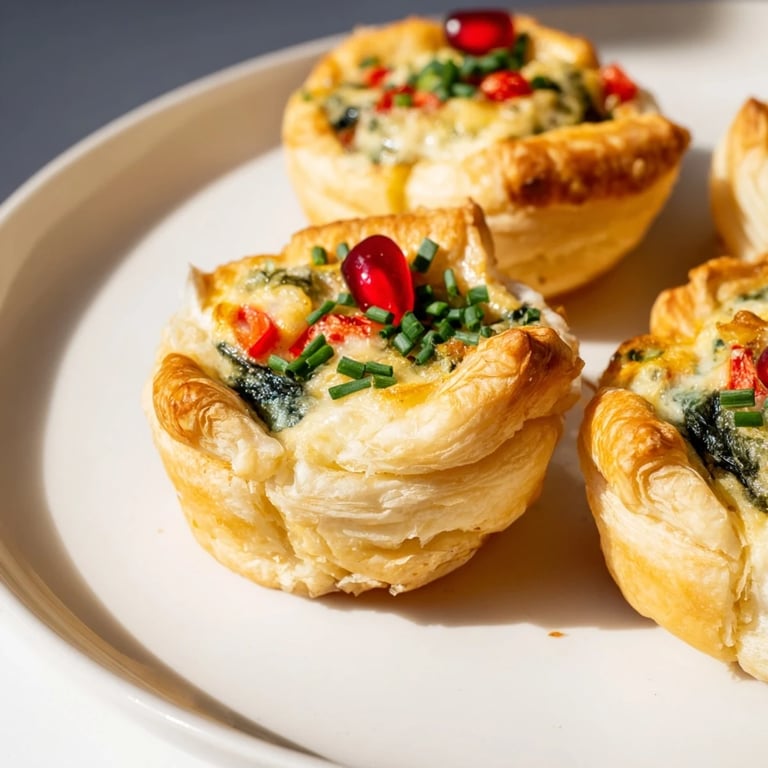 Pin It A festive and delicious arrangement of bite-sized mini quiches, shaped into a Christmas tree—perfect as a holiday party centerpiece or appetizer.