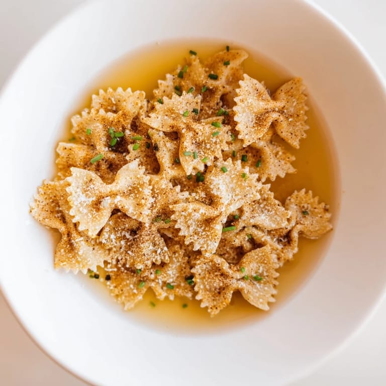 - Scatter grated parmesan and fresh chives over the top, then eat it immediately while the contrast between crispy pasta and warm broth is still alive.