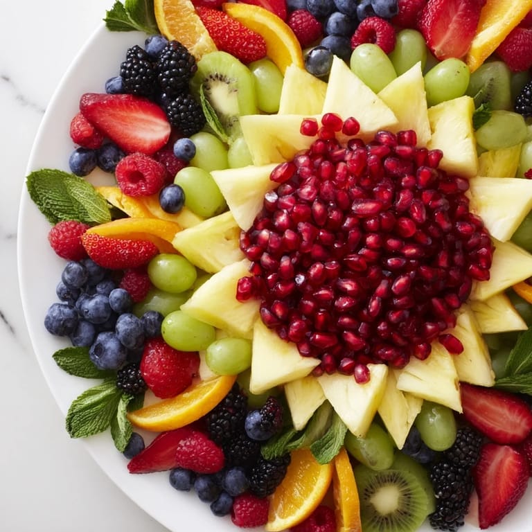 Pin It A vibrant and eye-catching fruit platter featuring juicy pomegranate arils arranged in a starburst pattern, complemented by a colorful selection of fresh fruits. Perfect as a festive centerpiece or a refreshing, healthy snack.
