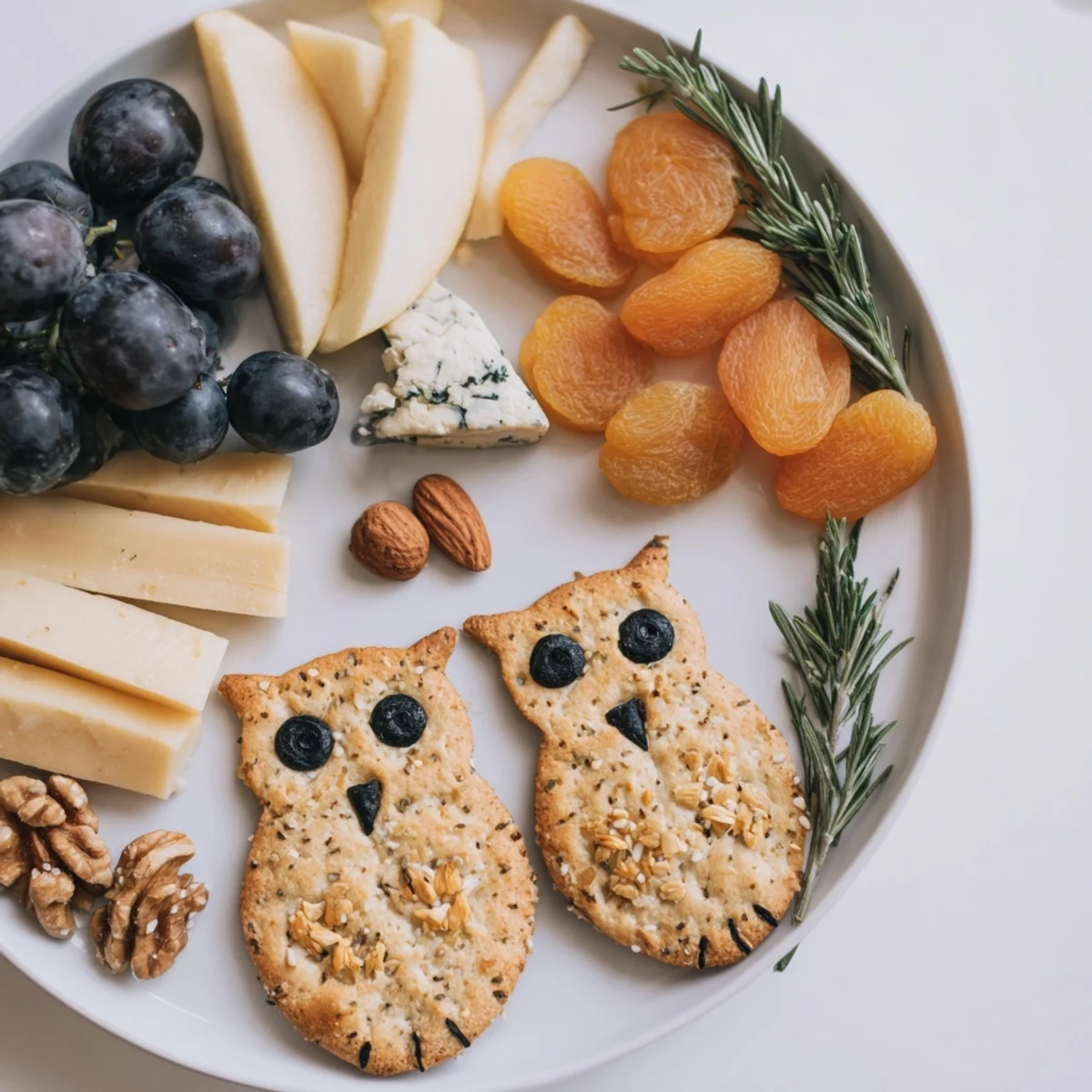 Arrange cheese slices with owl crackers, fruits, and nuts on a large wooden board. Garnish with rosemary sprigs and edible flowers for a forest-inspired presentation.