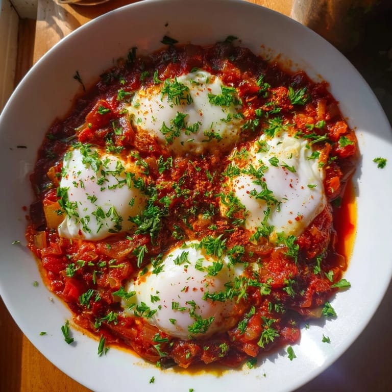 Pin It A vibrant, budget-friendly North African dish featuring poached eggs in a spiced tomato and pepper sauce. Perfect for breakfast, brunch, or a light dinner.